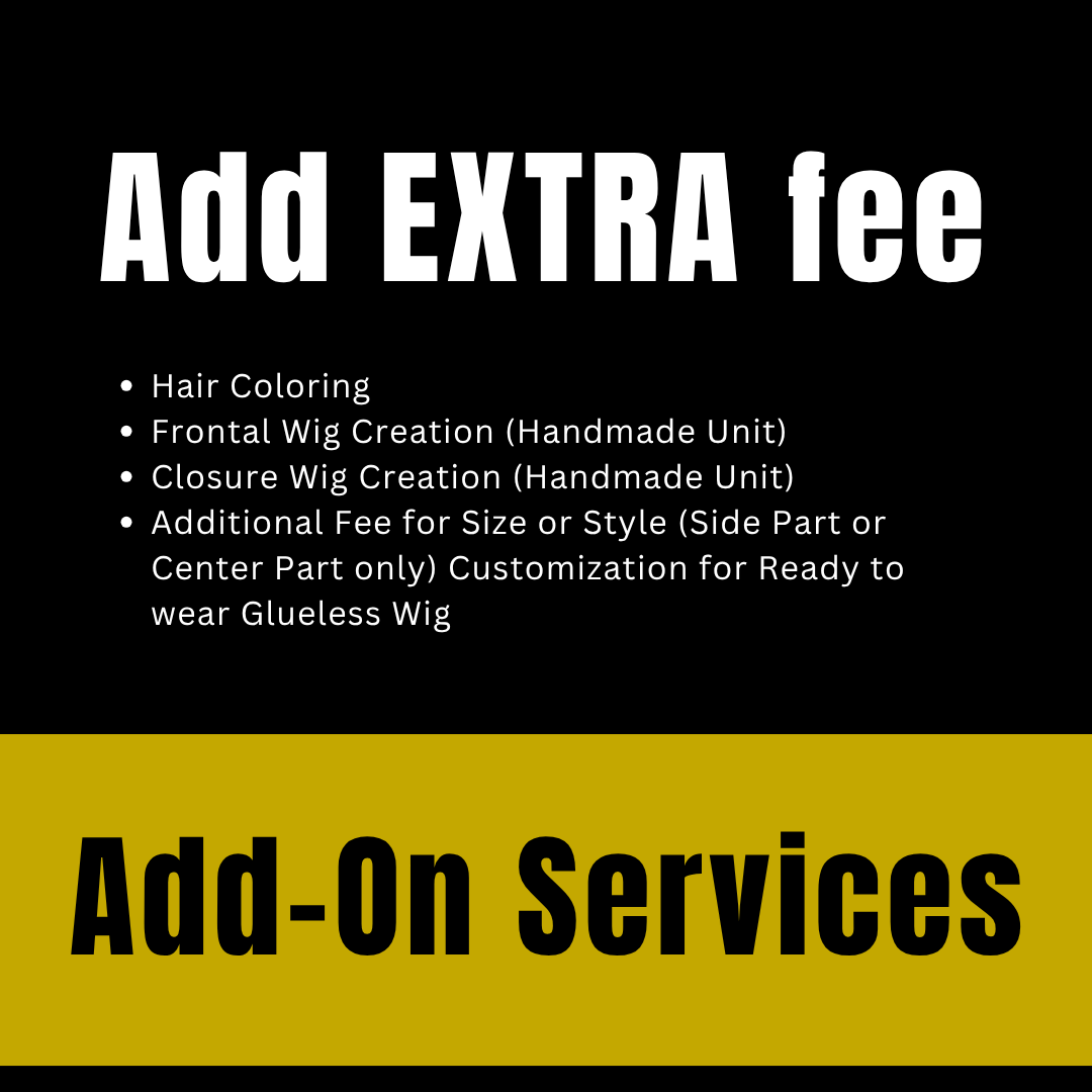 Our add-on services are designed to enhance the beauty and longevity of your custom wig. Whether it's a bold color transformation, handmade construction with precision, or personalized sizing and parting, each upgrade is done with expert care to match the quality of your unit. Because your wig should feel as good as it looks — made just for you, down to the last detail.